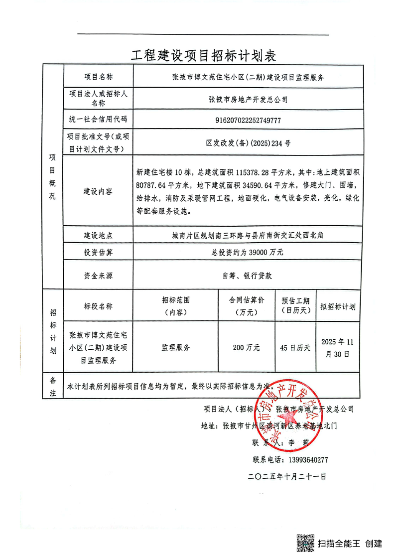 [市本级]张掖市博文苑住宅小区(二期)建设项目监理服务计划公告