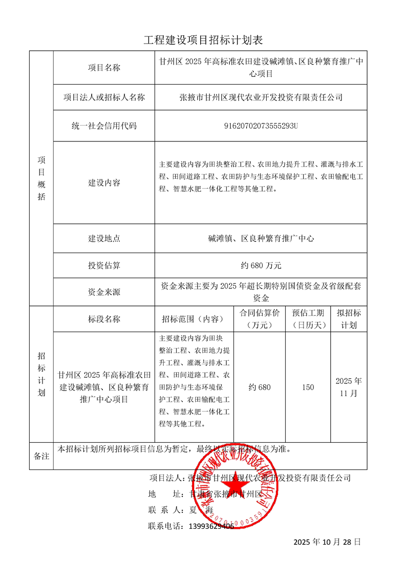 [市本级]甘州区2025年高标准农田建设碱滩镇、区良种繁育推广中心项目计划公告