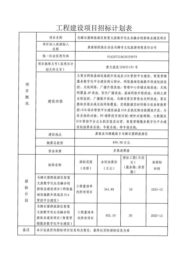 [肃南县]马蹄石窟群旅游区智慧文旅数字化生态融合创新体系建设项目计划公告