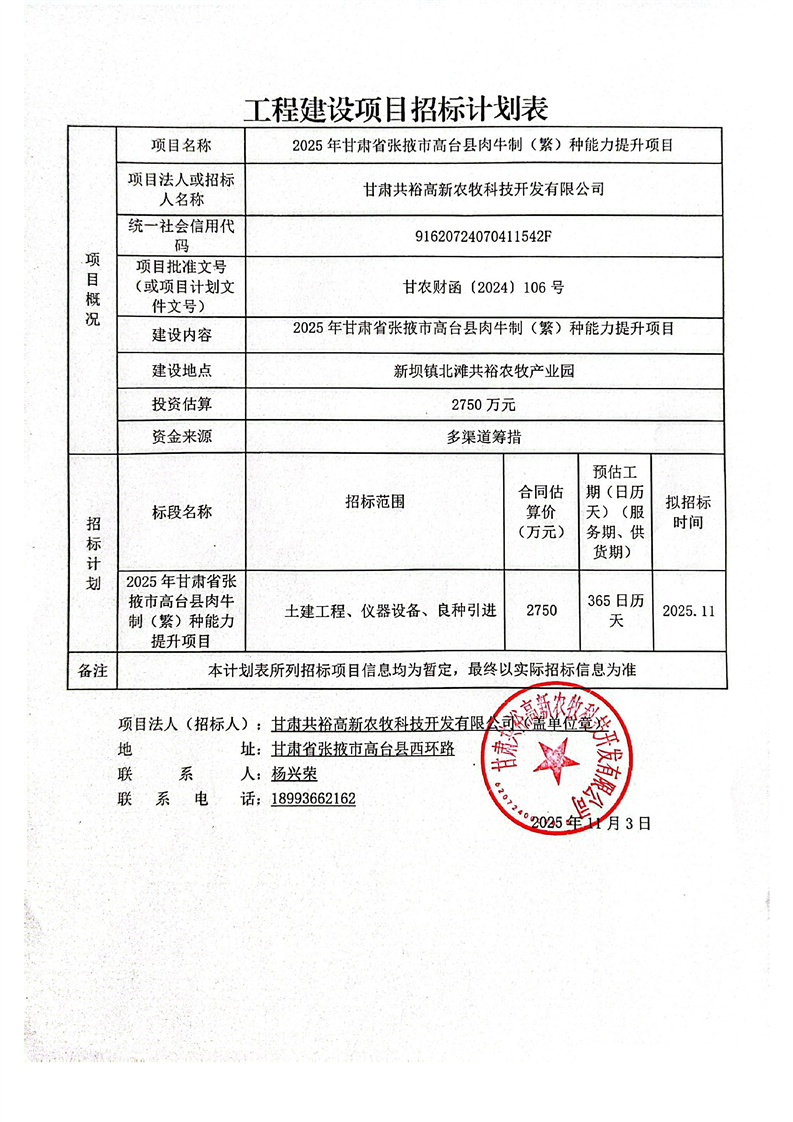 [高台县]2025年甘肃省张掖市高台县肉牛制(繁)种能力提升项目计划公告