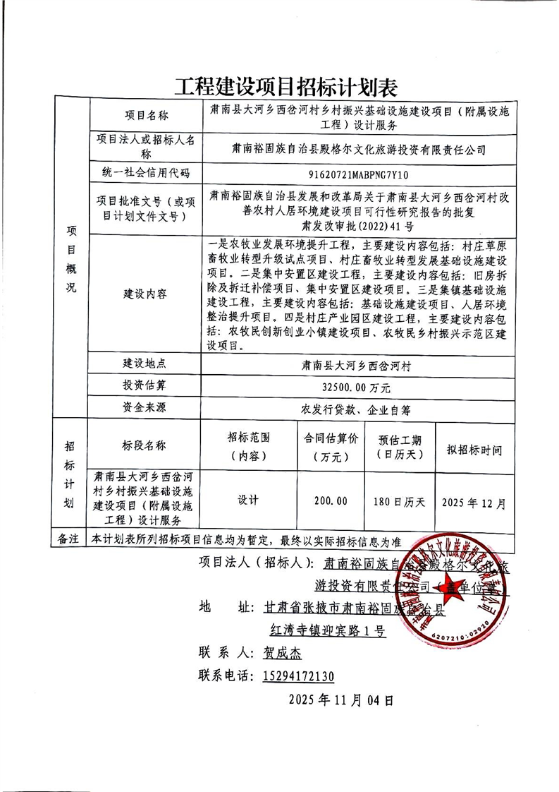 [肃南县]肃南县大河乡西岔河村乡村振兴基础设施建设项目(附属设施工程)设计服务计划公告