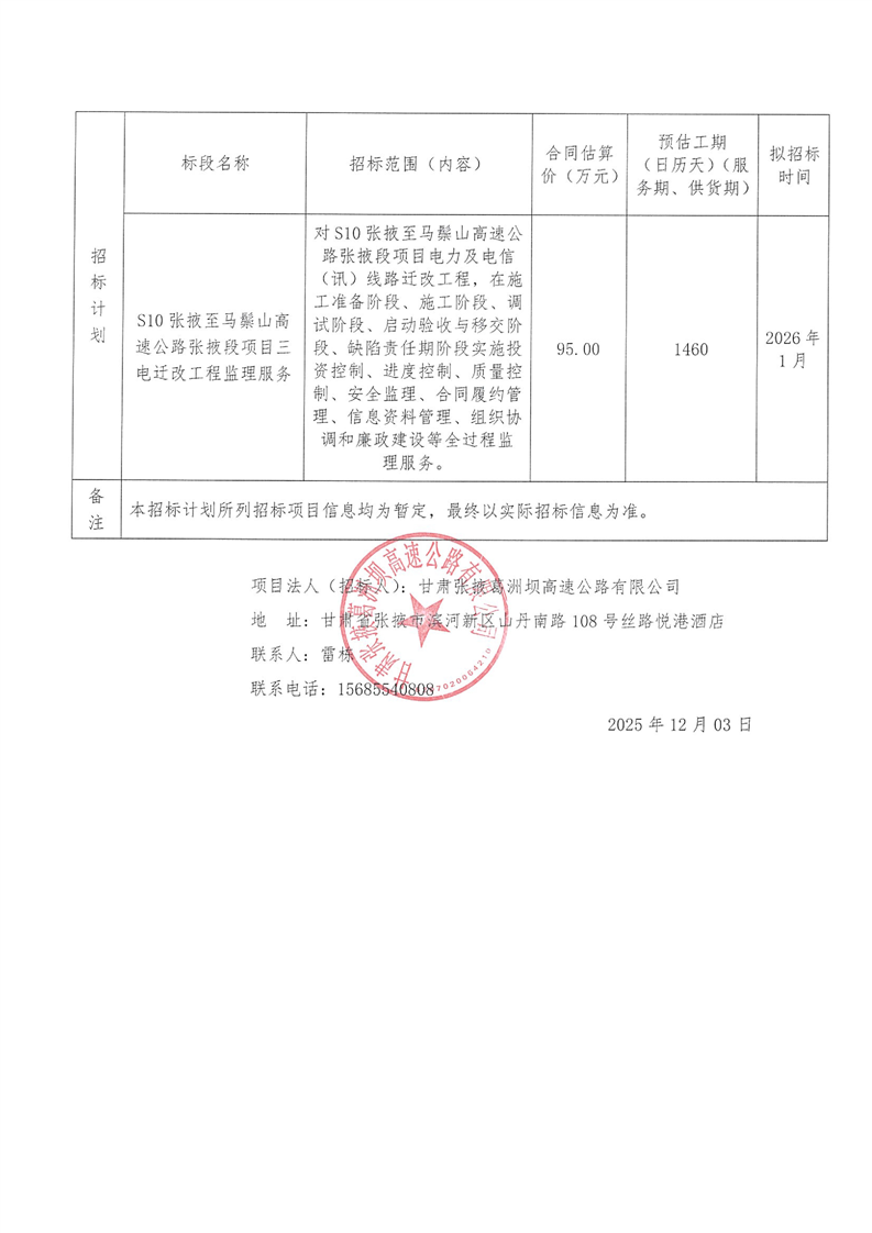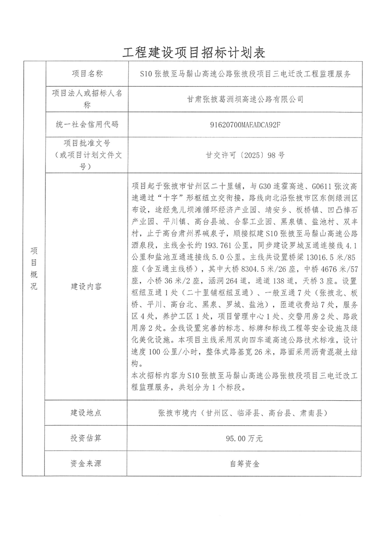 [市本级]S10张掖至马鬃山高速公路张掖段项目三电迁改工程监理服务计划公告