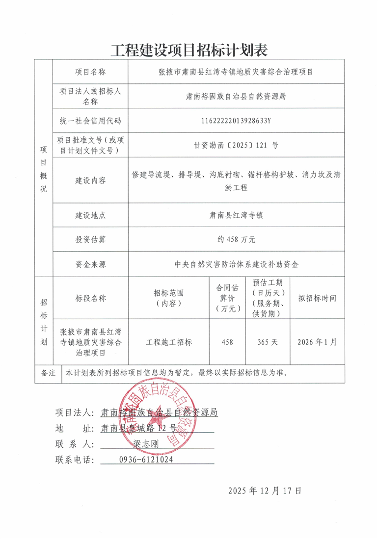 [肃南县]张掖市肃南县红湾寺镇地质灾害综合治理项目计划公告