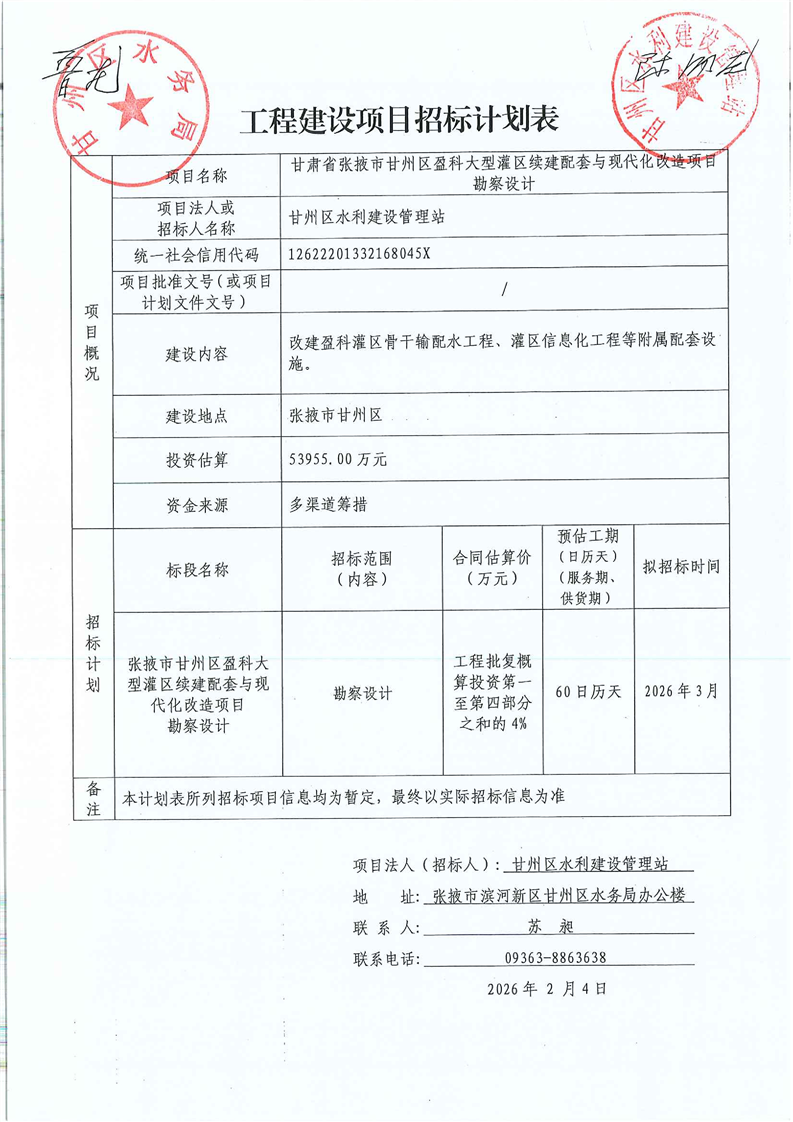 [市本级]甘肃省张掖市甘州区盈科大型灌区续建配套与现代化改造项目勘察设计计划公告