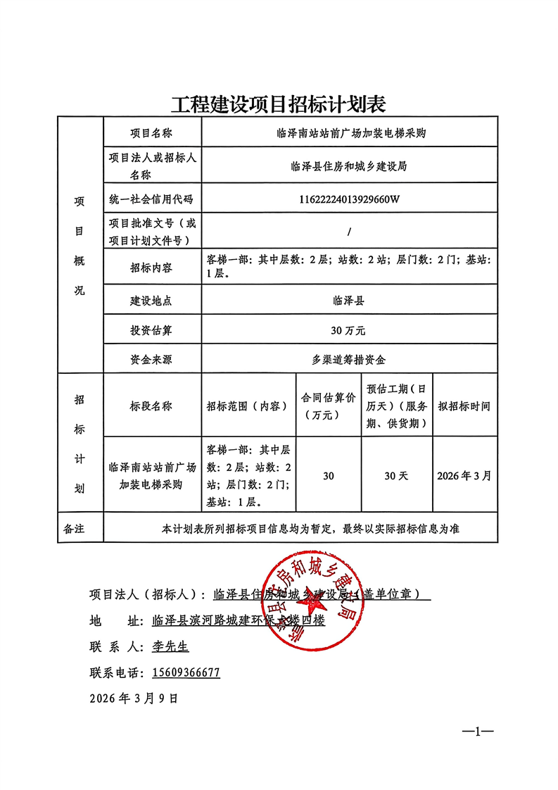 [临泽县]临泽南站站前广场加装电梯采购计划公告