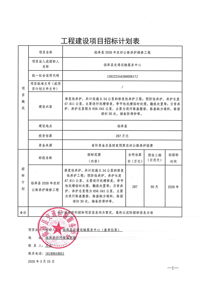 [临泽县]临泽县2026年农村公路养护维修工程计划公告
