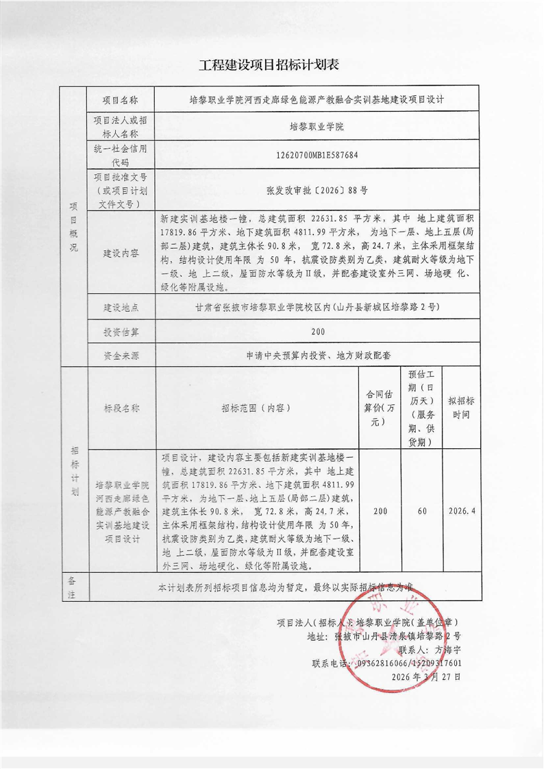 [市本级]培黎职业学院河西走廊绿色能源产教融合实训基地建设项目设计计划公告