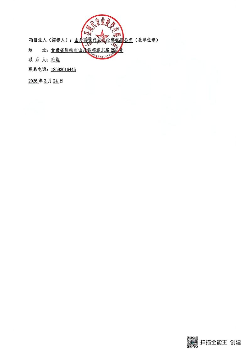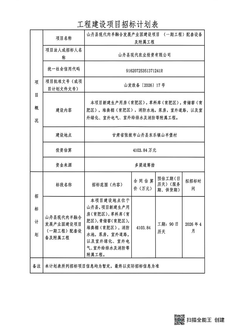 [山丹县]山丹县现代肉羊融合发展产业园建设项目(一期工程)配套设备及附属工程计划公告