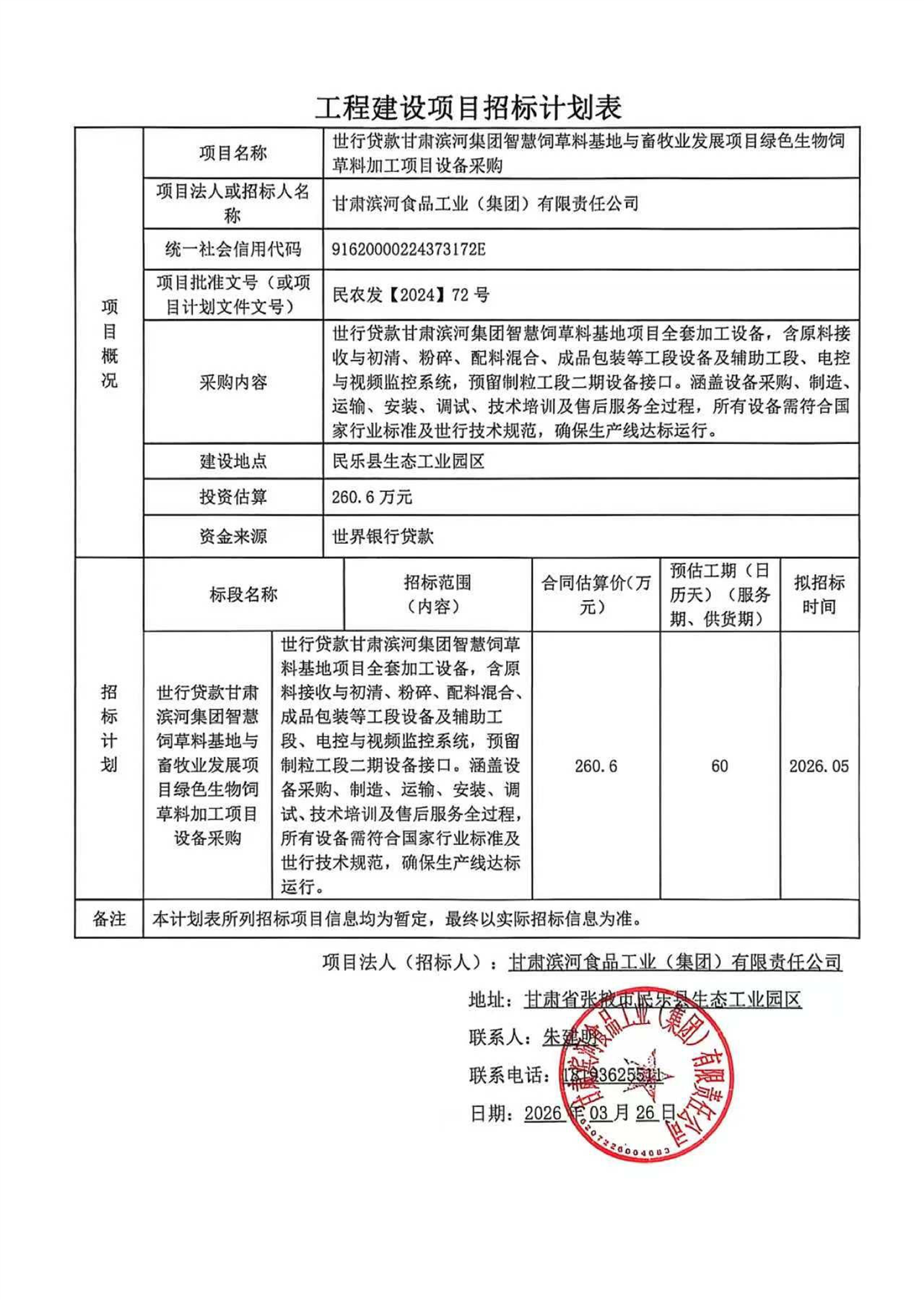 [民乐县]世行贷款甘肃滨河集团智慧饲草料基地与畜牧业发展项目绿色生物饲草料加工项目设备采购计划公告